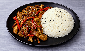 ღორის ხორცი, ბრინჯი, ბულგარული წიწაკა, სტაფილო, ხახვი, ნიორი, სეზამის მარცვლები