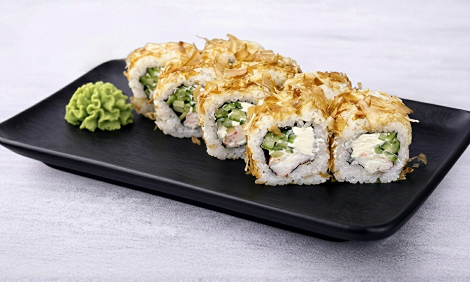 კრევეტები, თინუსის ფანტელები, კრემ-ყველი, კიტრი, ბრინჯი, ნორი, ტერიაკის სოუსი