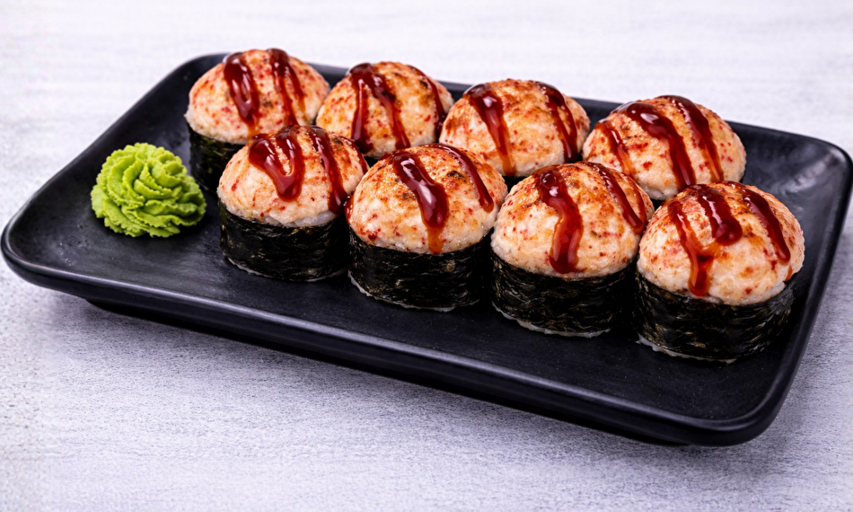 როლი კრევეტით, კრემ ყველით, კიტრი და პომიდვრით, ზემოდან გამომცხვარი აიაში სოუსით