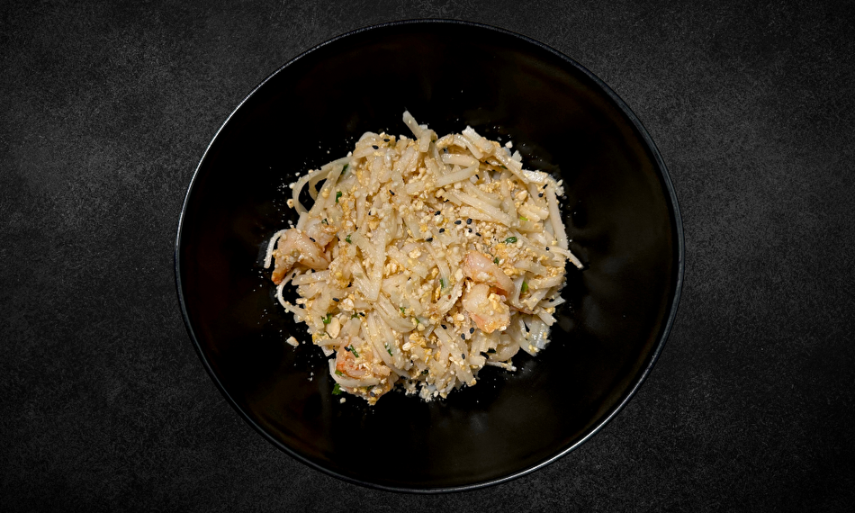 კრევეტები, ბრინჯის ლაფშა, კვერცხი, ნიორი, მწვანე ხახვი, ლაიმი, მიწის თხილი