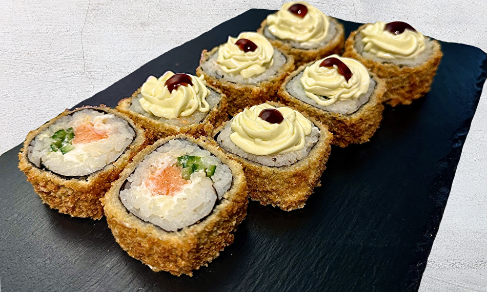 Лосось, сливочный сыр, огурец, соус унаги. Имбирь, васаби, соевый соус